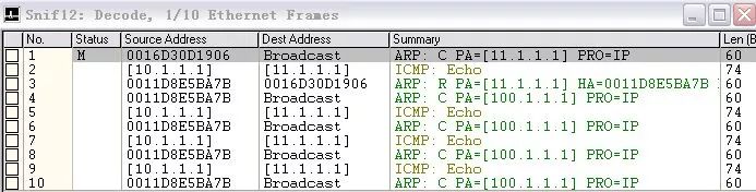 抓到的结果与第2种情况一样,A依然是先广播询问11.1.1.1的MAC,这个ARP广播被B接到后,B有义务应答,于是双方知道对方MAC,所以能PING通。