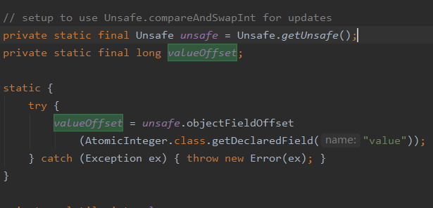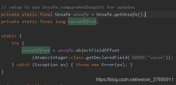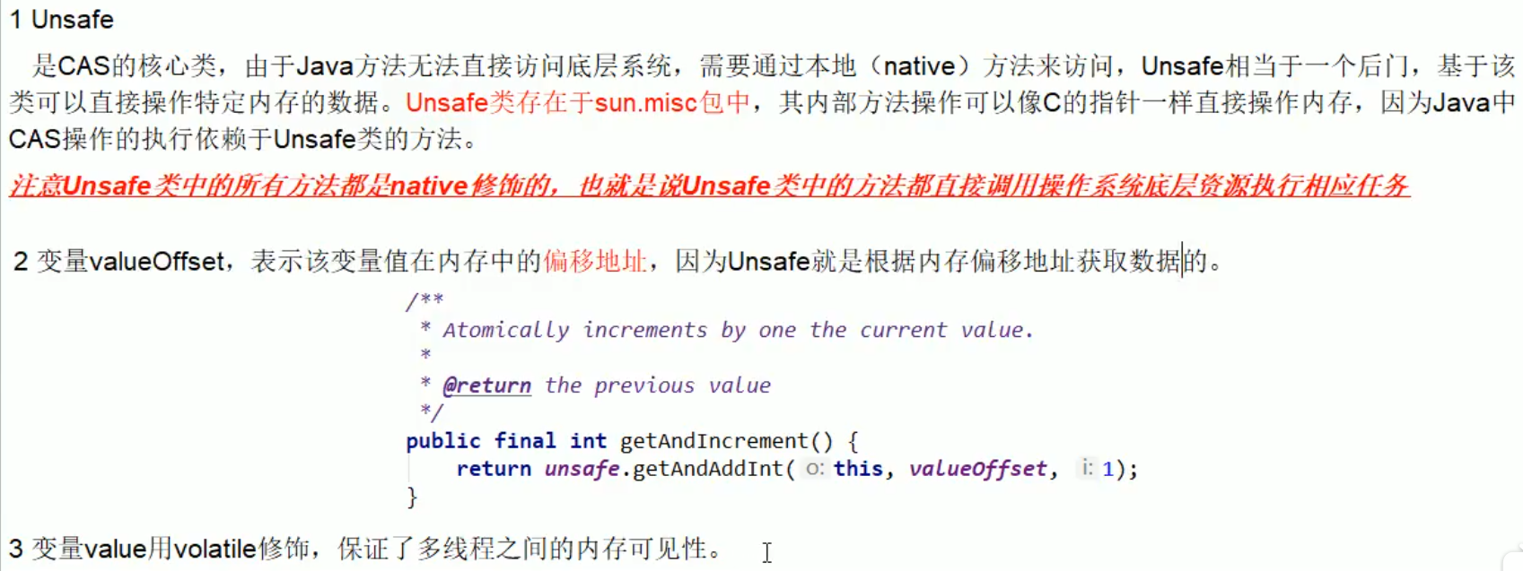 return unsafe.getAndAddInt(this, valueOffset, 1); //getAndIncrement()中调用了unsafe对象所在类中(Unsafe类在sun.mics包中)已经封装好了的getAndAddInt(this, valueOffset, 1)方法,所以这里不重要(但是是这个方法里有do while架构,即真正使用了CAS的就是这个方法)
