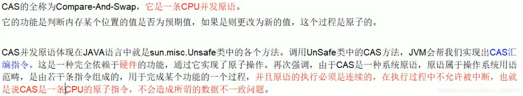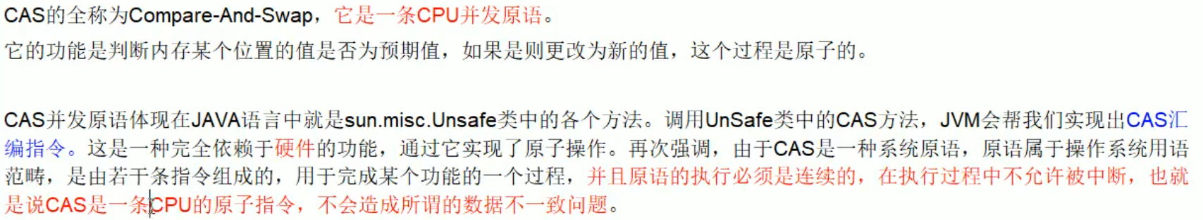 CAS:compareAndSwap(比较并交换,这里的比较是将自己的期望值(即期望主内存中是这个值)与主内存中的值比较)