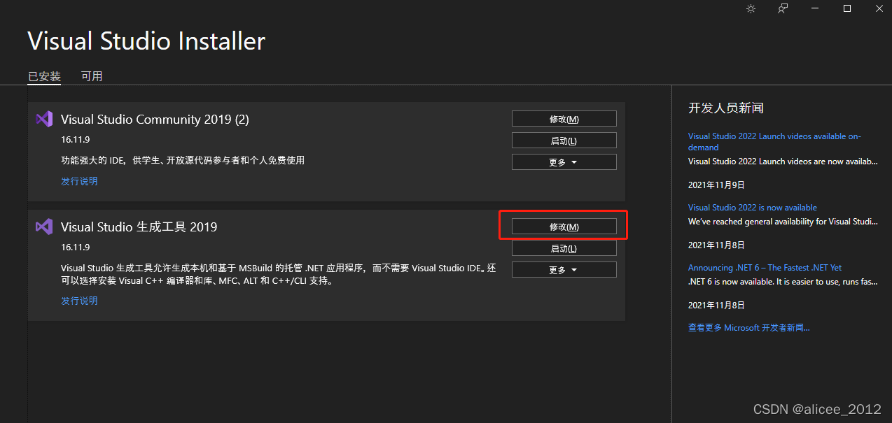步骤二:下载并打开 Visual Studio Installer,点击下图中的“修改”:
