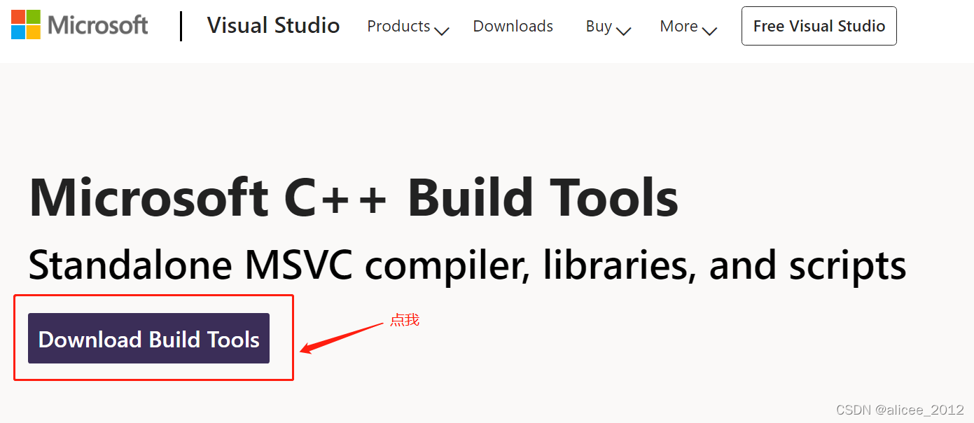 步骤一:点进去官方给出的 'Get it with Microsoft Visual C++ Build Tools...'后面的网址 https://visualstudio.microsoft.com/visual-cpp-build-tools/。