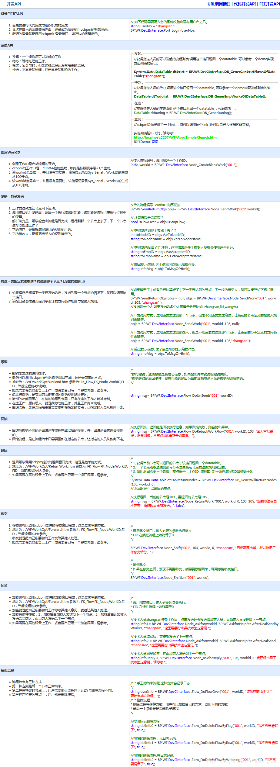 - 驰骋BPM的工作处理器创建工作ID、发送、退回、移交、删除、加签、会签等操作也是调用BP.WF.Dev2Interface.Node_*通过流程接口对流程的操作比如:流程的删除、回滚、撤销、冻结、取消冻结等流程的操作都是操作的BP.WF.Dev2Interface.Flow_*开发接口。