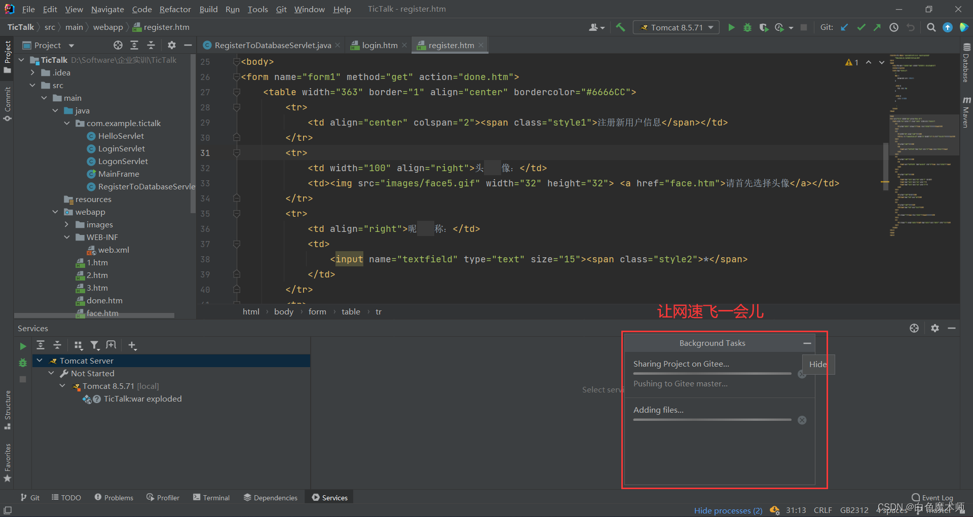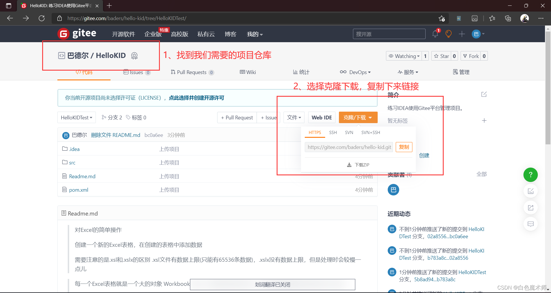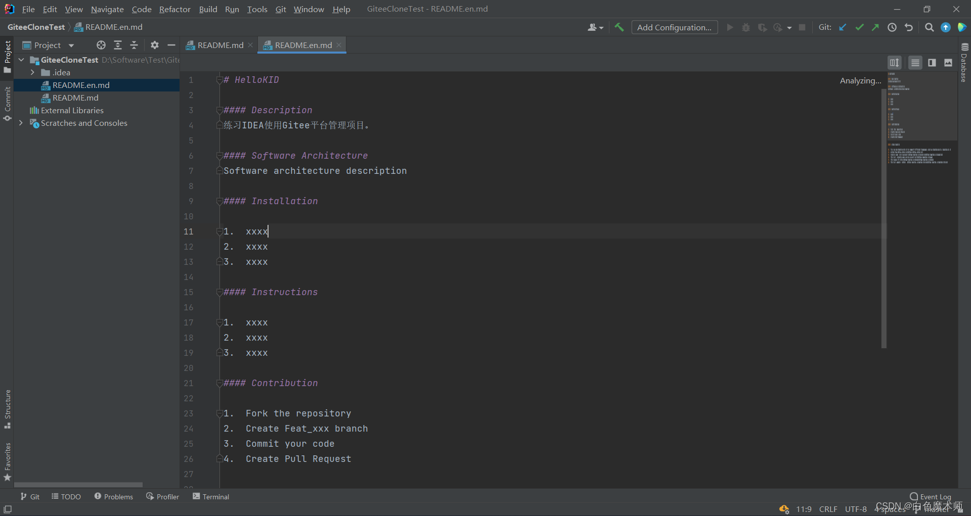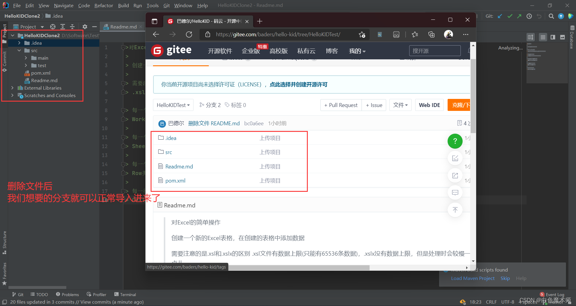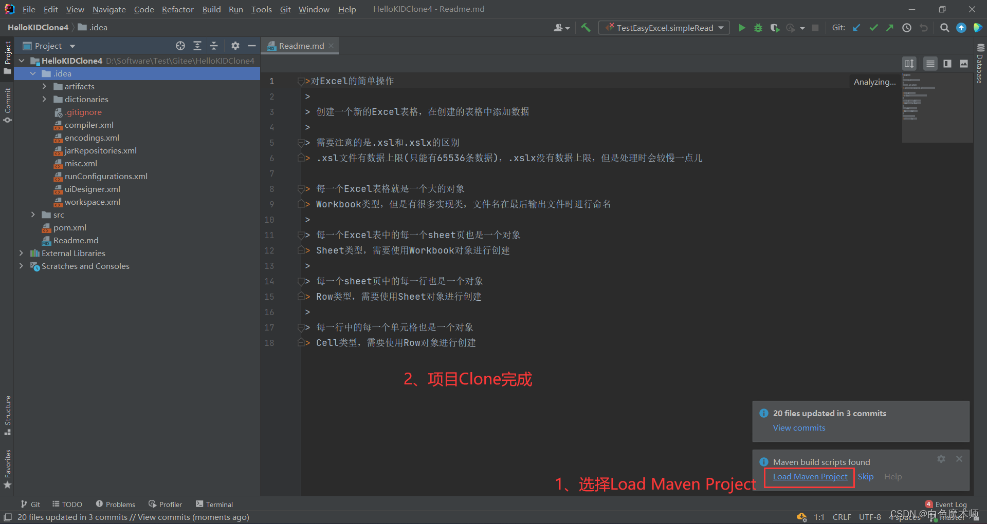 等网速飞一会儿。下载好后我们可以发现,Gitee平台上的添加的内容已经同步到我们的IDEA中了。