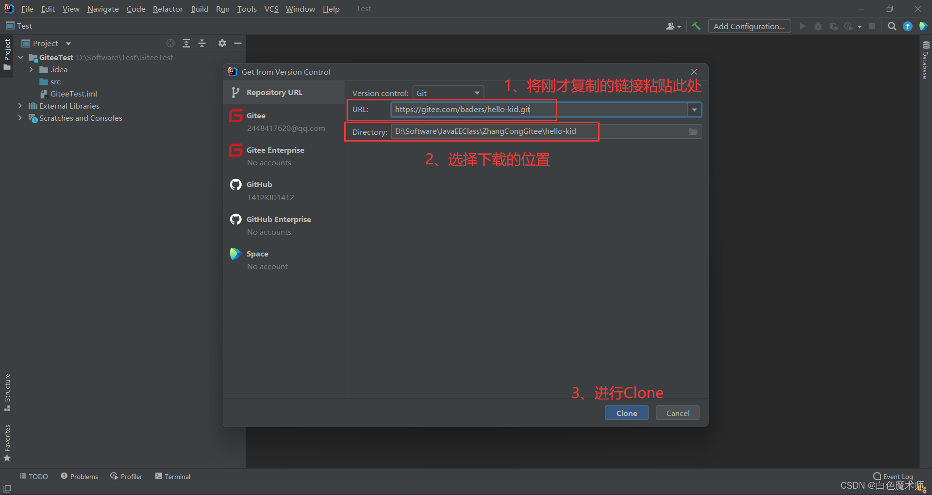 将刚才复制的链接粘贴在URL的地方,选择下载项目的目录,进行Clone。