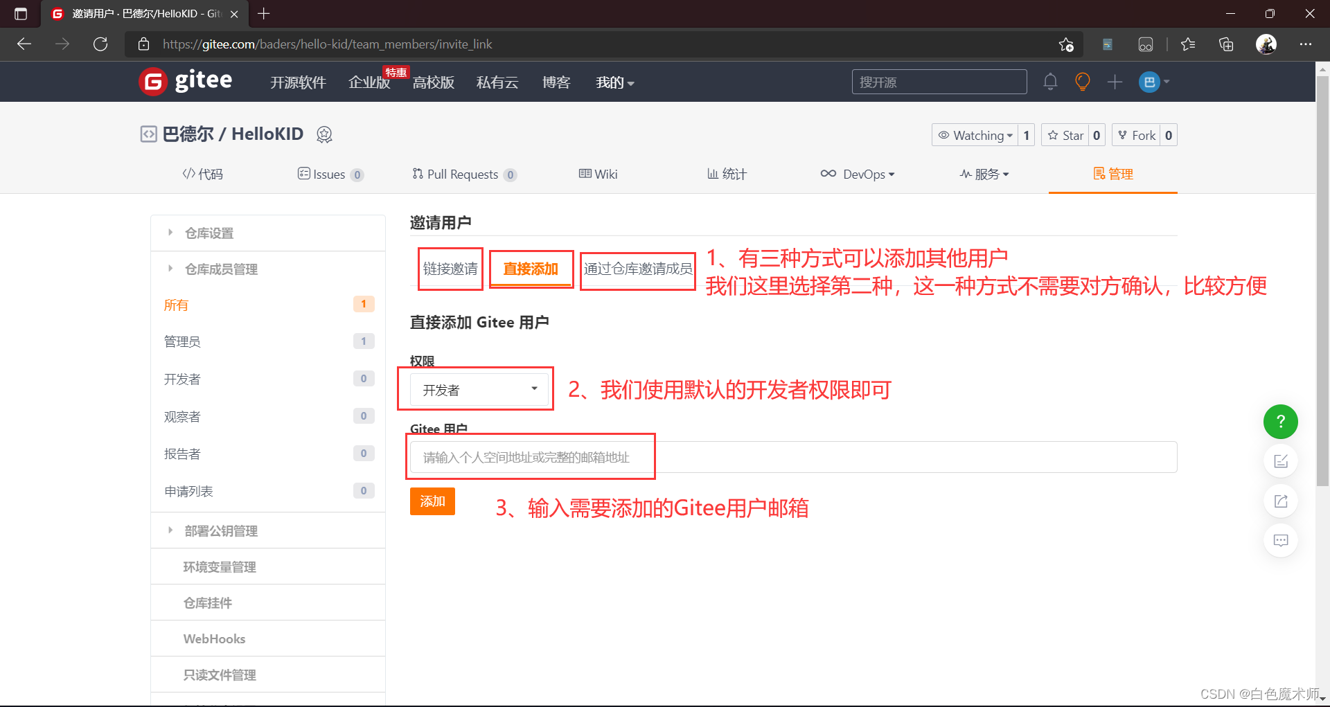 有三种方式添加用户,我们可以选择任意的一种进行添加,但是不管是哪一种方式,都需要设置权限,上传项目的最低权限是开发者,我们设置开发者即可,如果提供更高的权限可能会对仓库造成不可预估的影响。