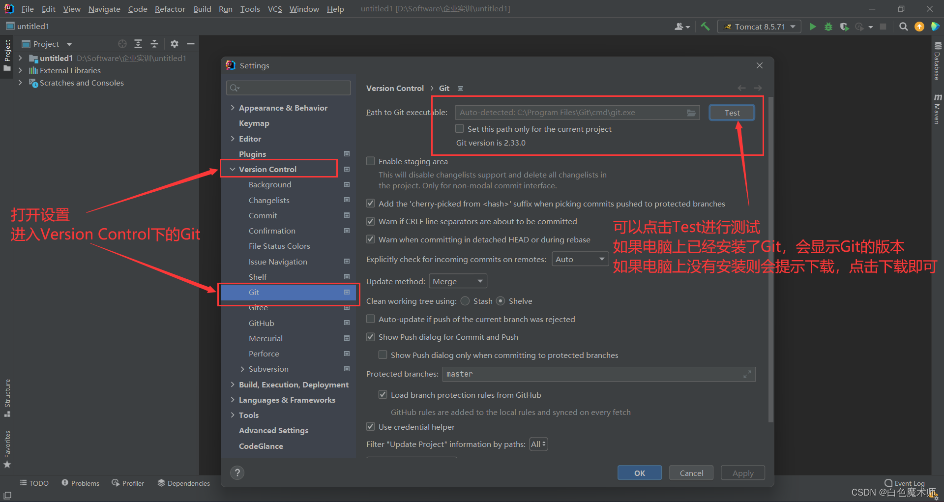 不管使用Gitee还是GitHub,我们都需要在电脑上安装Git版本控制系统。进入Settings里面,对Version Control下的Git进行设置,我们可以先点击右边的Test进行查看我们电脑上是否安装了Git,如果已经安装了Git,则会显示当前安装的Git版本号(我的电脑是已经安装了Git,所以显示的是版本号);如果目前还没有安装Git,则会提示下载,我们点击下载安装即可。