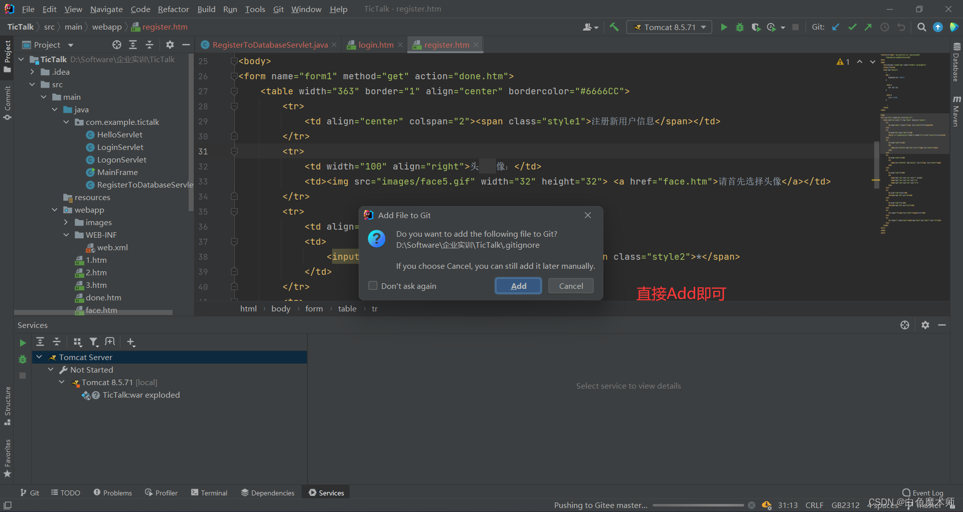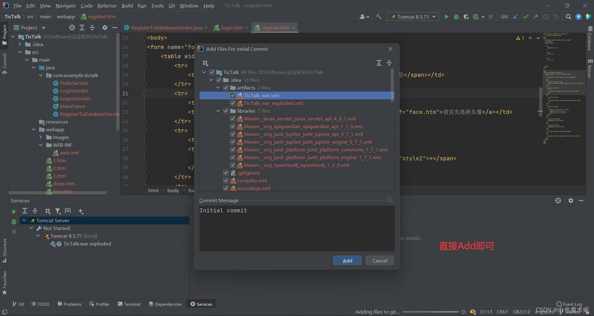 提示我们是否将项目添加到本地Git,我们选择Add即可。