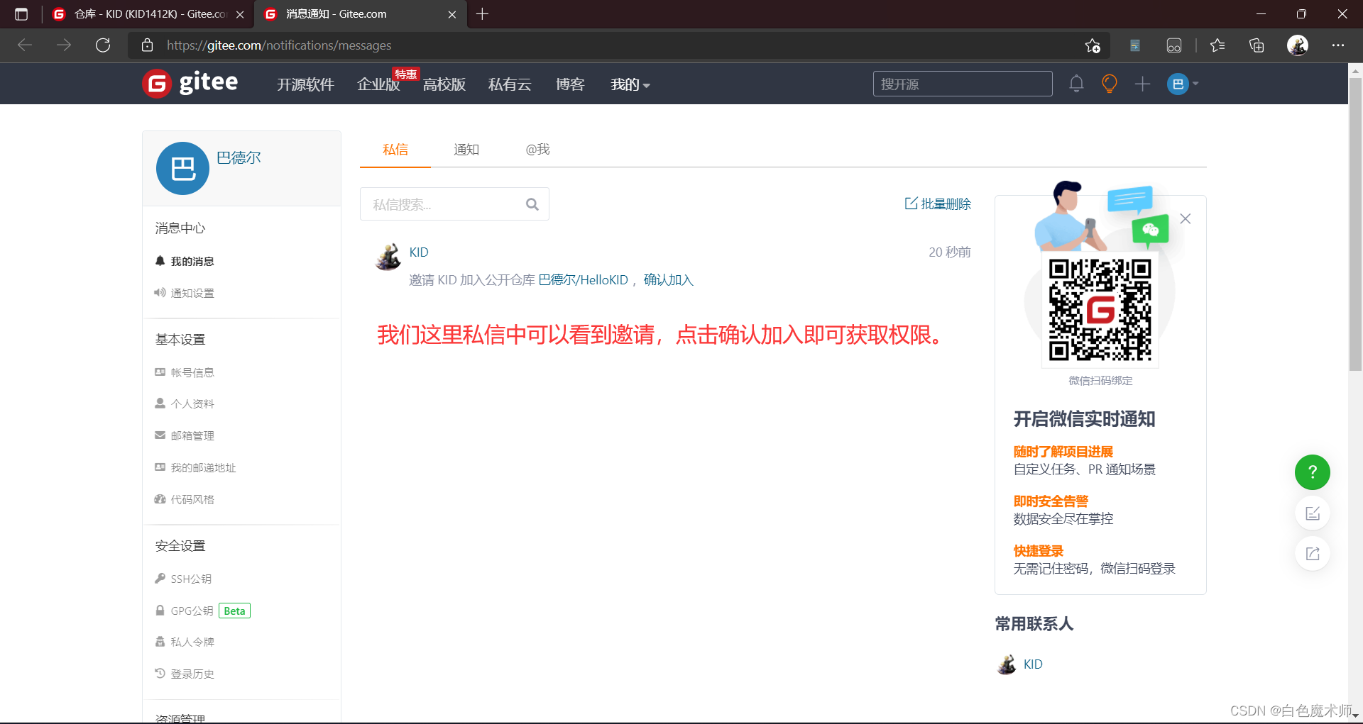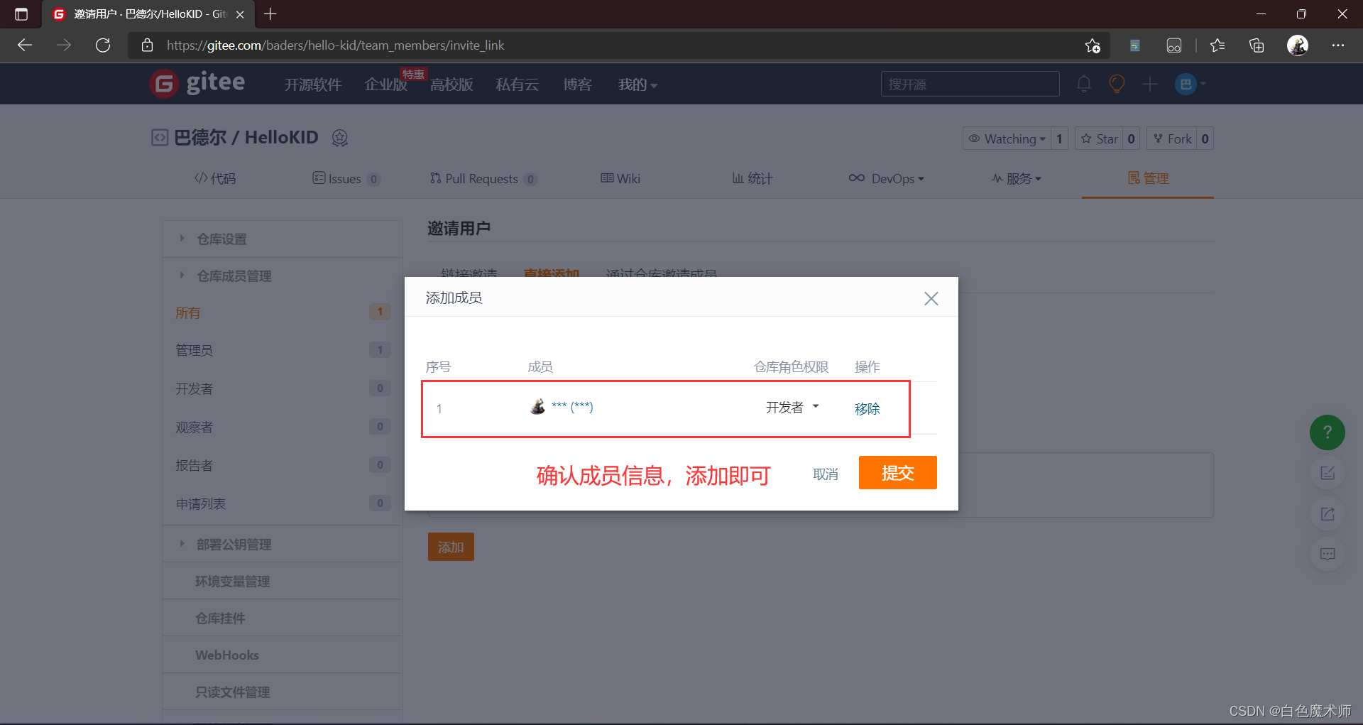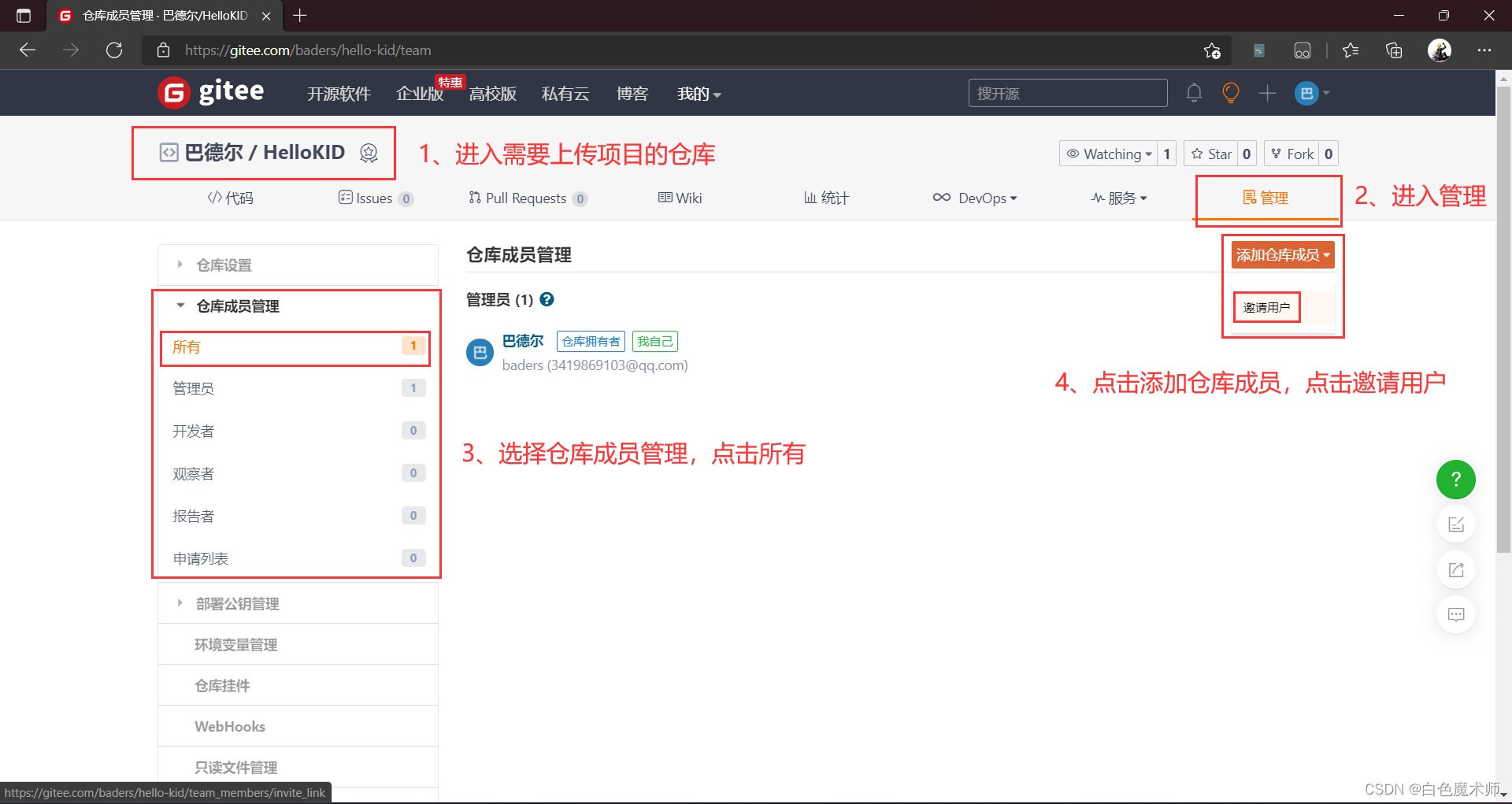 我们进入需要上传项目的仓库,进入仓库管理,选择仓库成员管理,点击所有,点击右边的添加仓库成员,点击邀请用户。