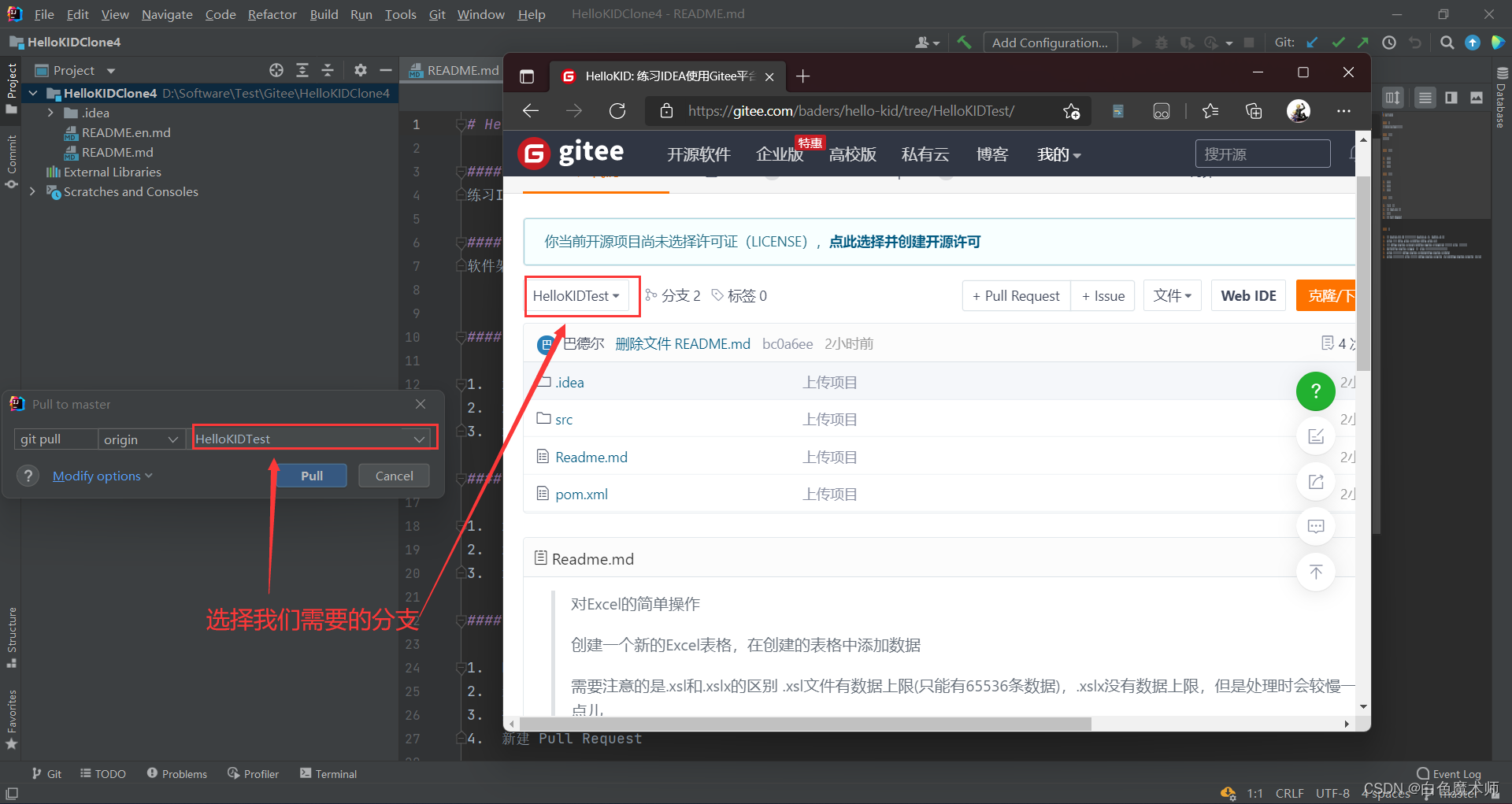 选择我们需要的HelloKIDTest分支,点击Pull。