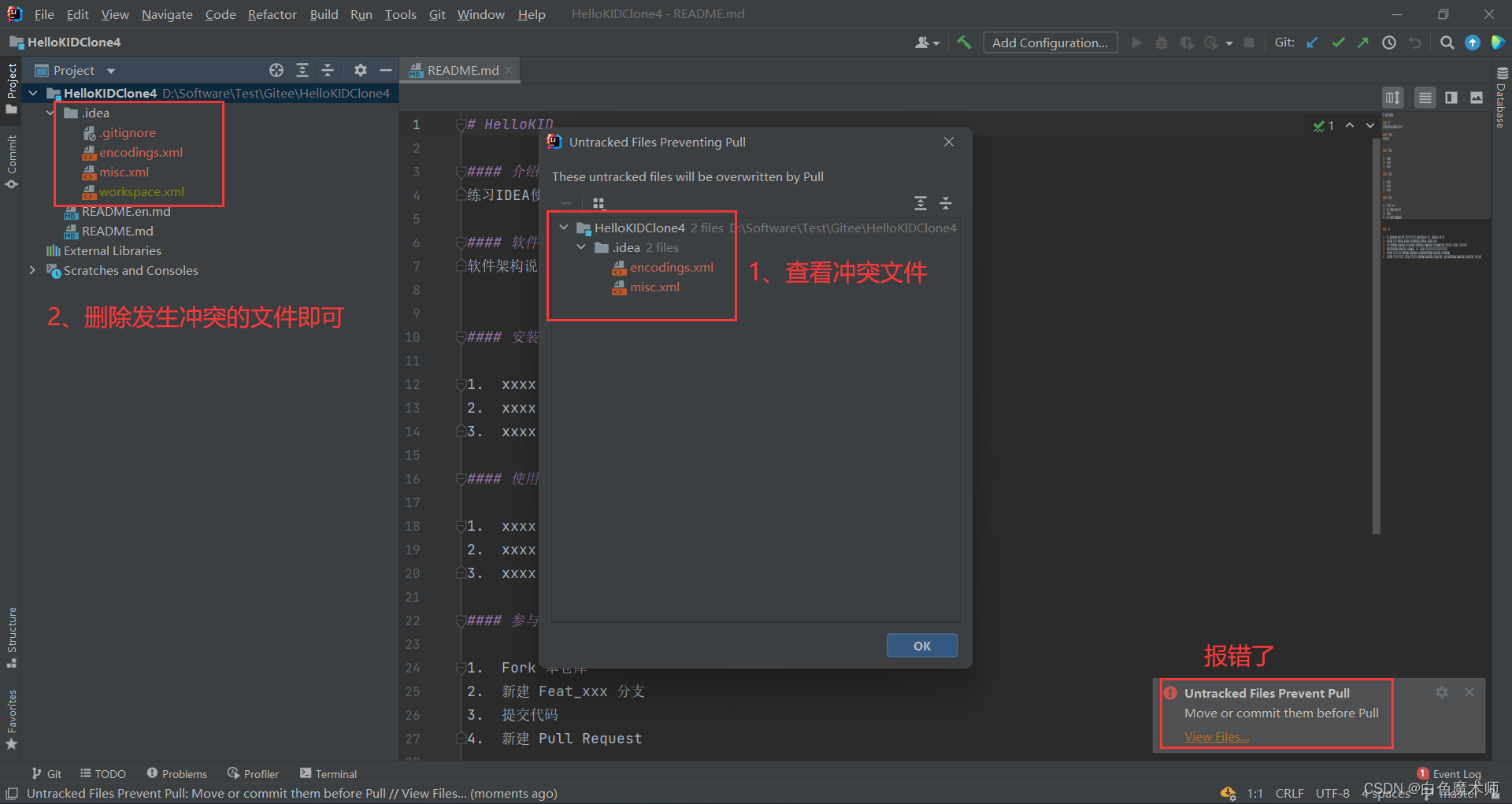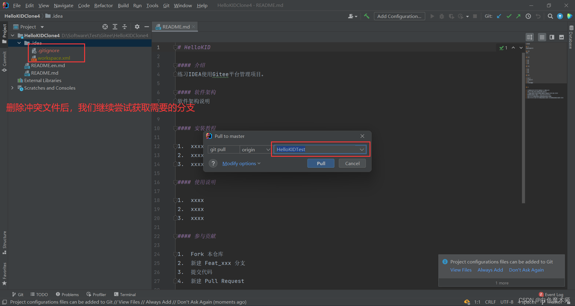 删除项目中冲突的文件,再次尝试刚才的步骤,重新尝试获取我们需要的分支。