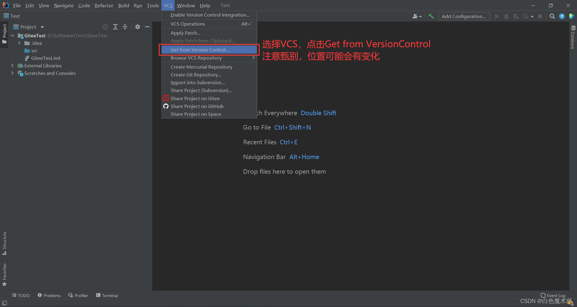 项目创建好后,选择VCS,点击Get from VersionControl,由于IDEA的配置不同,该按钮的位置可能会出现变化,需要仔细甄别。