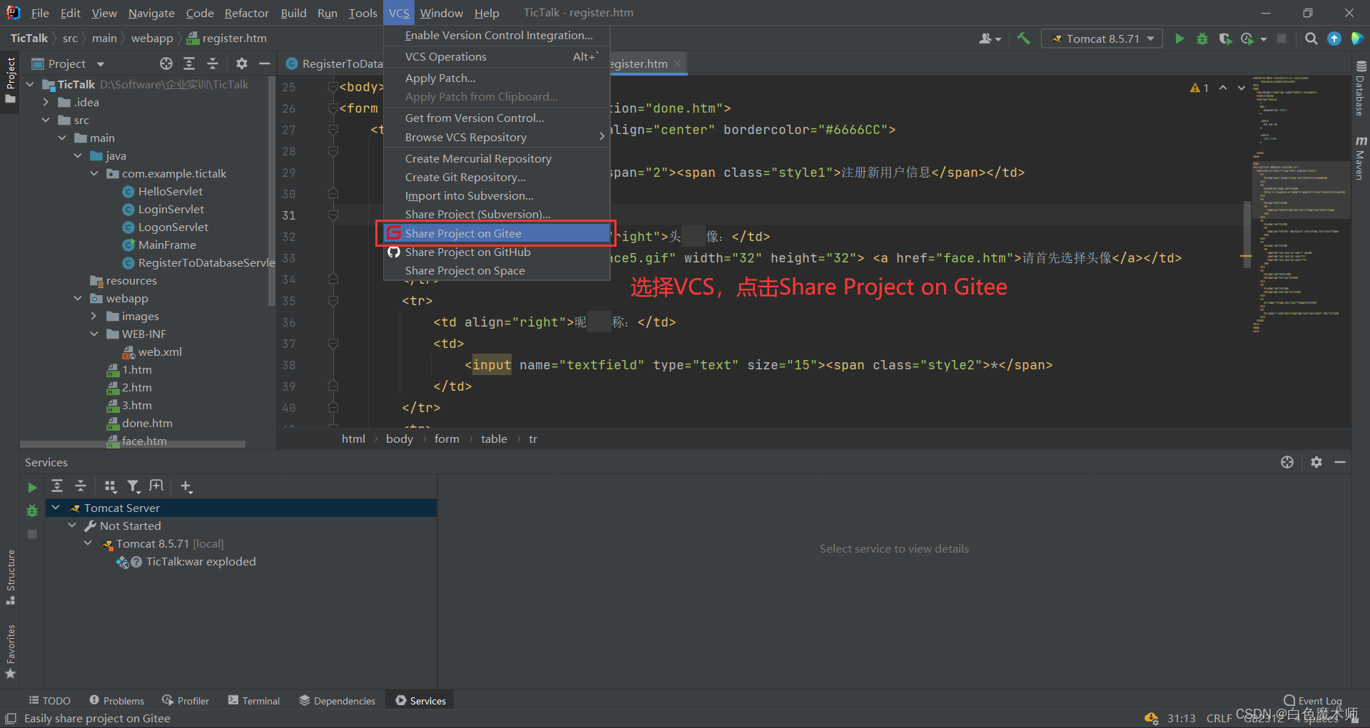 上传到自己的仓库较为简单,选择VCS后点击Share Project on Gitee(需要下载Gitee的插件,否则无法上传)。