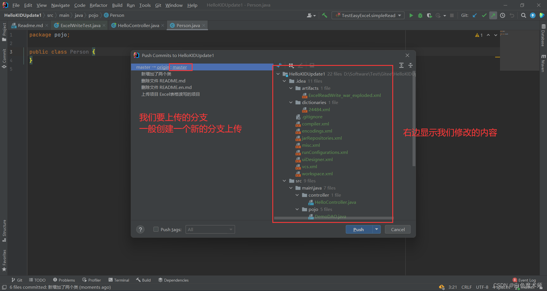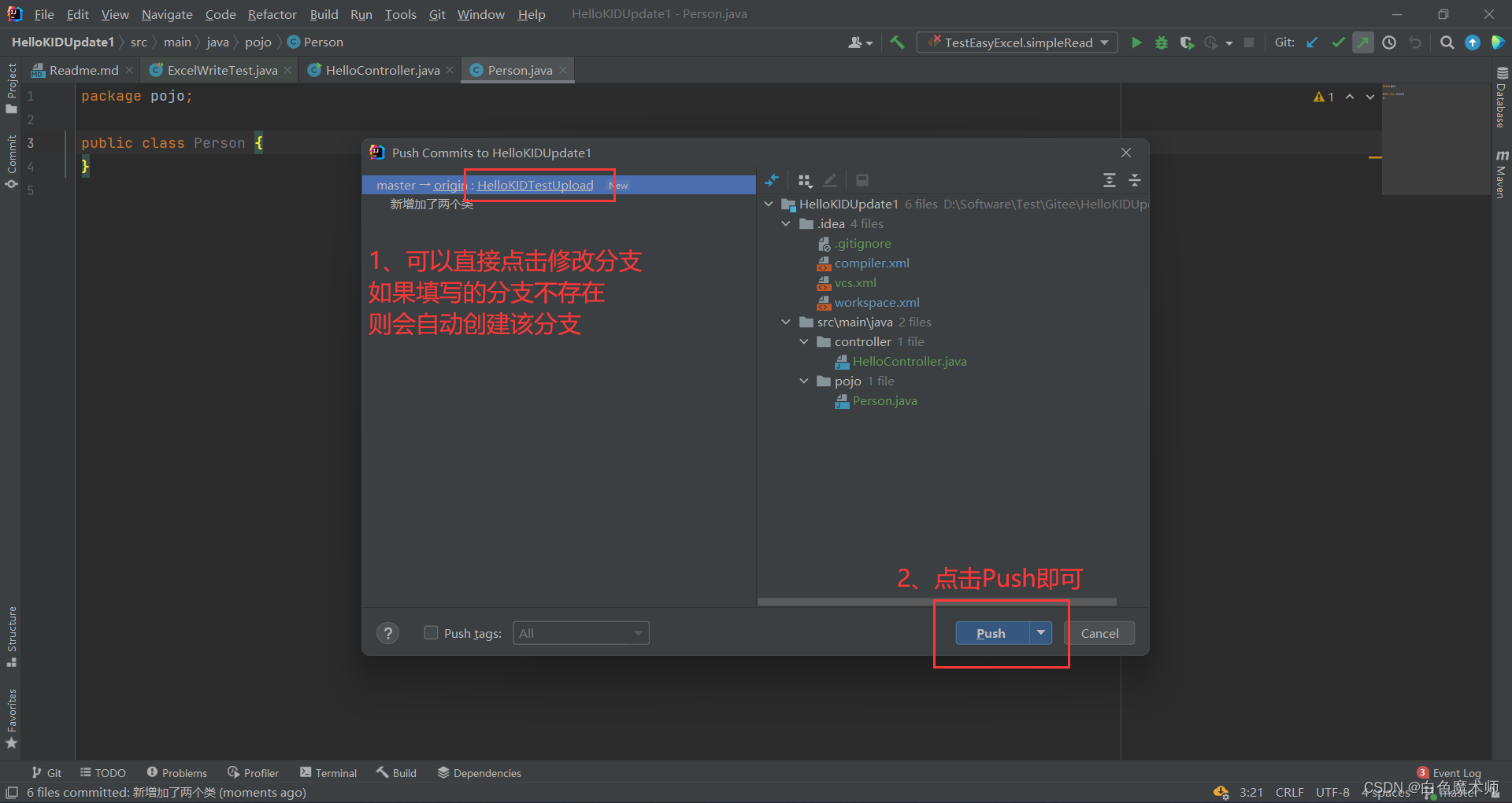 点击Commit and Push后,会显示我们要上传的文件,还有上传的分支。但是我们一般需要将自己的项目上传到新的分支中,以免对其他人的项目造成影响。