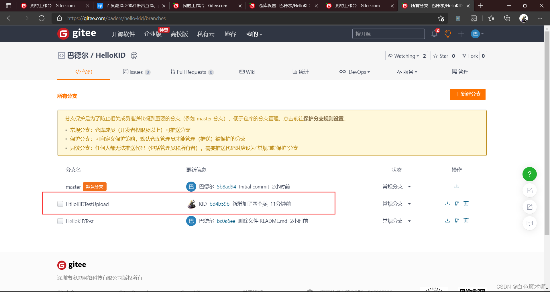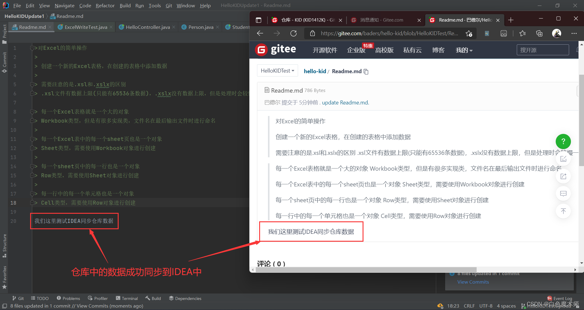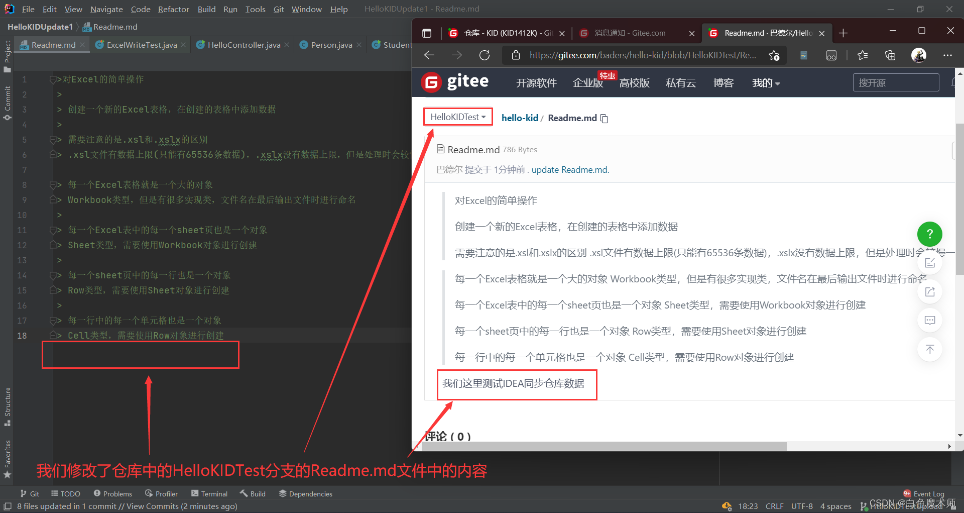 我们先在Gitee平台中修改HelloKIDTest分支的Readme.md文件中的信息,在最后添加一句话来模拟其他用户上传的代码。