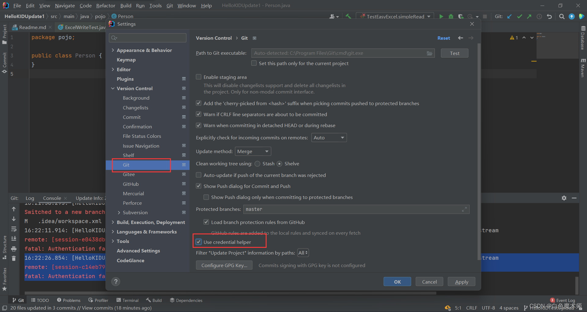 fatal: Authentication failed for 'https://gitee.com/baders/hello-kid.git/'打开设置,进入Git,勾选Use credential helper即可解决这个问题。