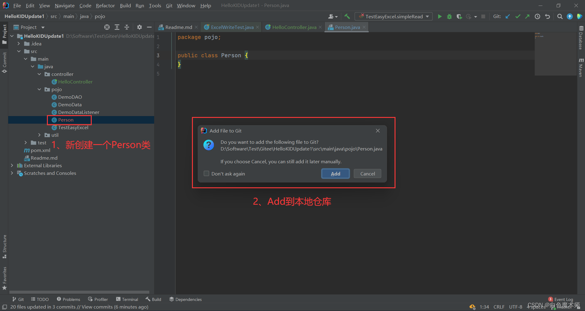 我们在刚才Clone的项目中添加两个类。添加完成后会提示我们是否添加到本地仓库,我们这里选择Add。