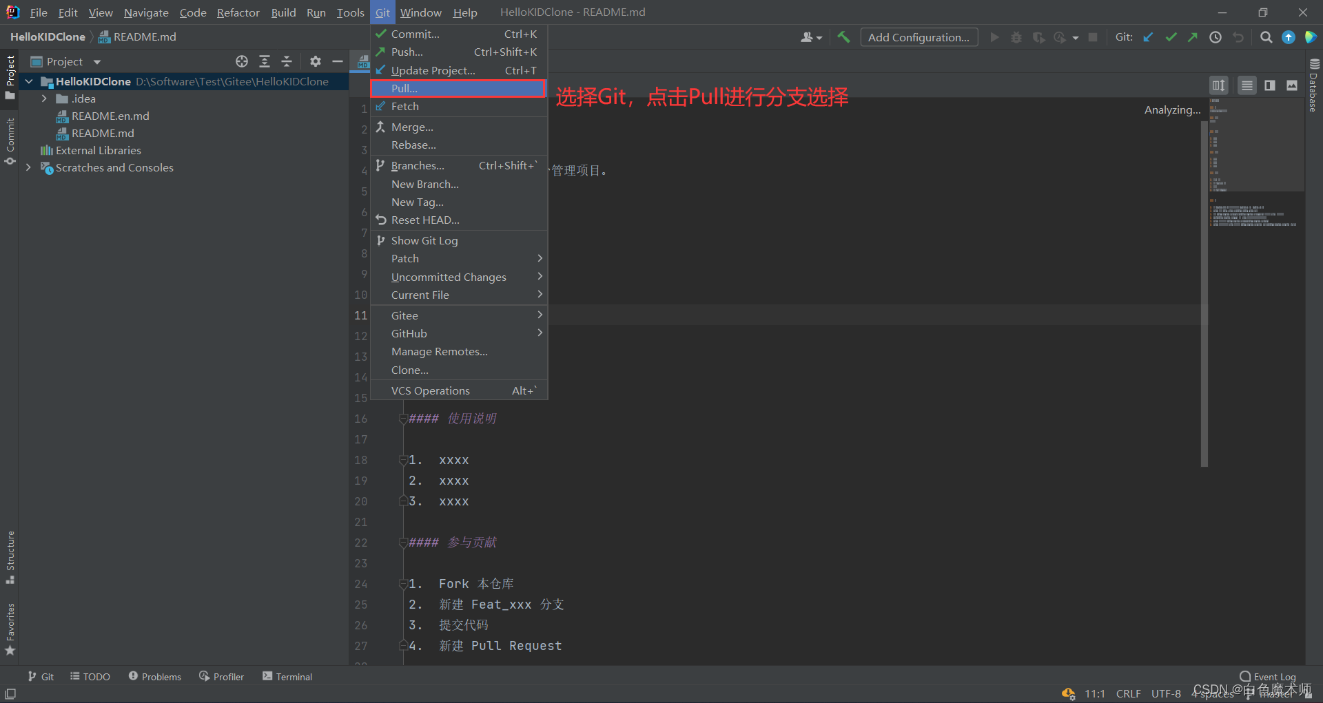 默认分支设置的是master分支,并不是我们需要的HelloKIDTest分支,我们需要在IDEA中进行选择HelloKIDTest分支。我们选择Git,点击Pull进行分支选择。