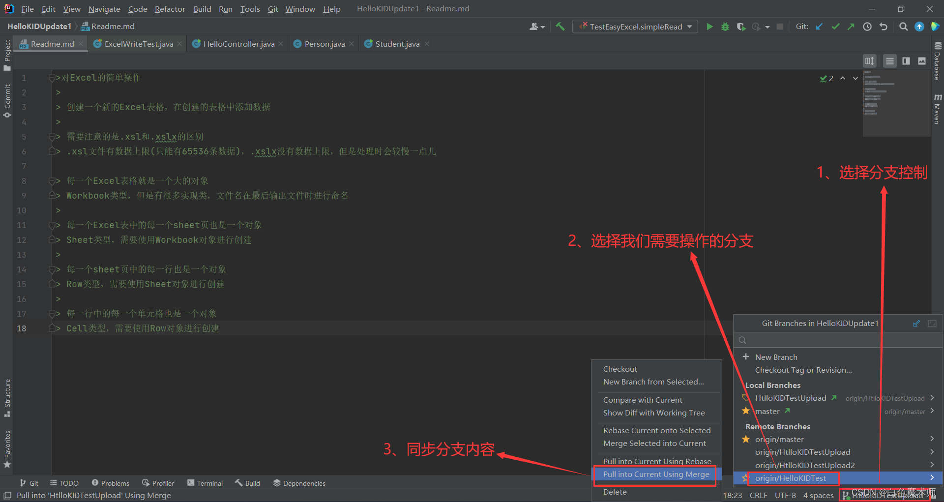 点击右下角的版本控制(当前显示的是其他分支名,但是这个并不影响我们后续的操作),选择HelloKIDTest分支,点击Pull into Current Using Merge。
