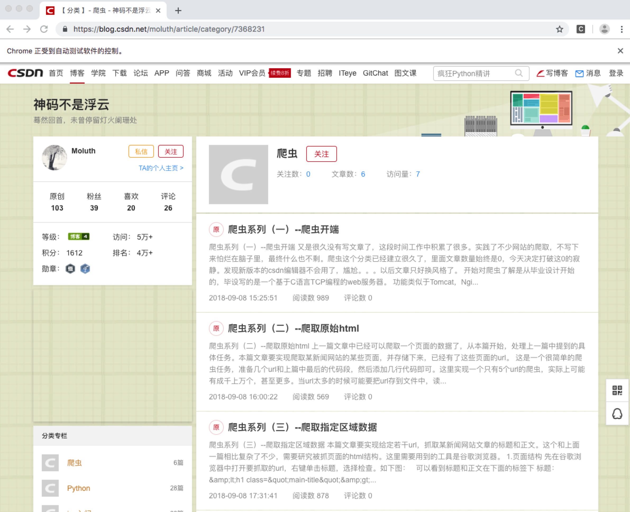 driver.get("https://blog.csdn.net/moluth/article/category/7368231")如果能打开下面的页面说明已经可以继续进行下面的步骤了