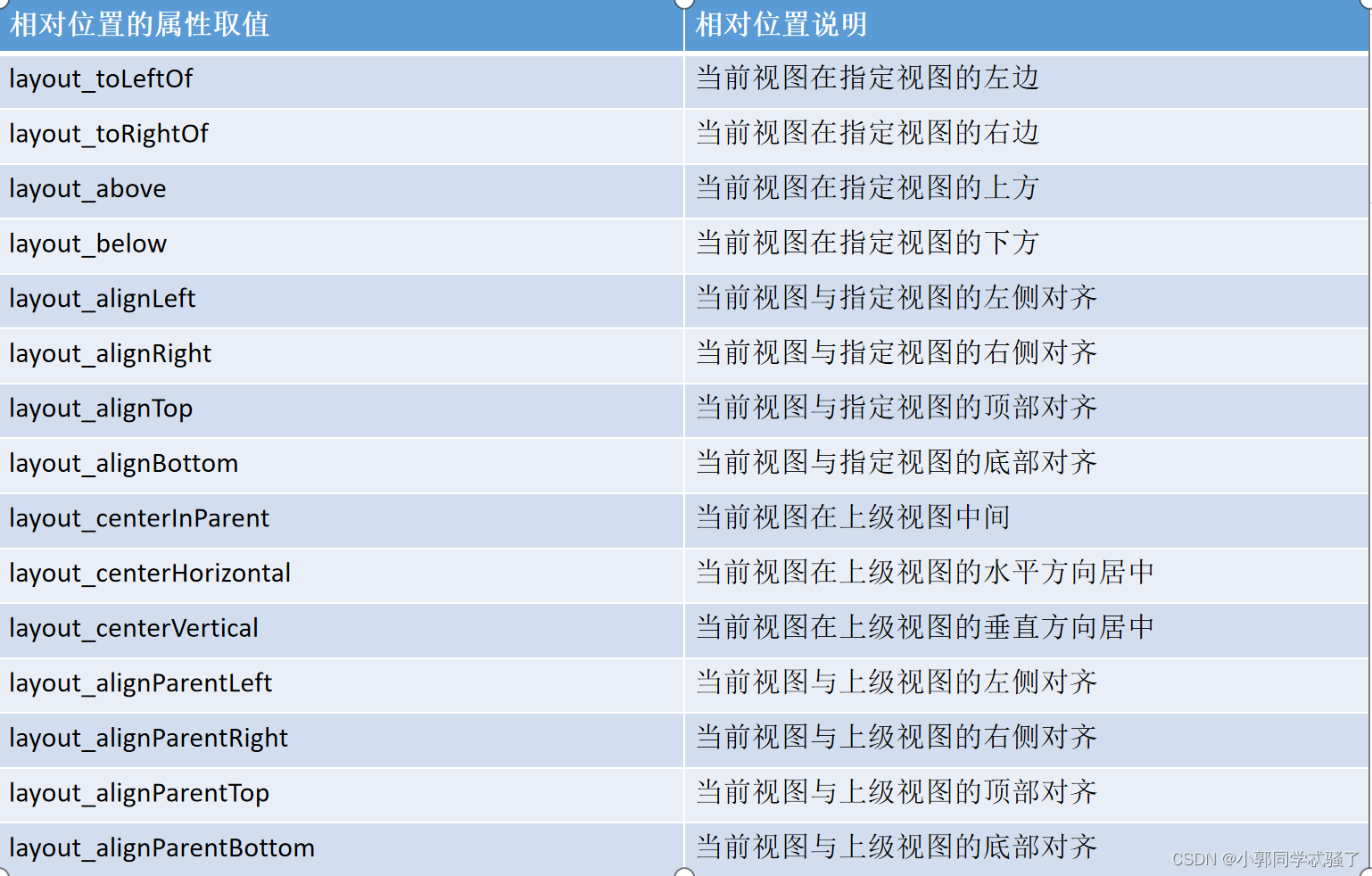 相对布局的下级视图位置由其他视图决定。用于确定下级视图位置的参照物分两种: