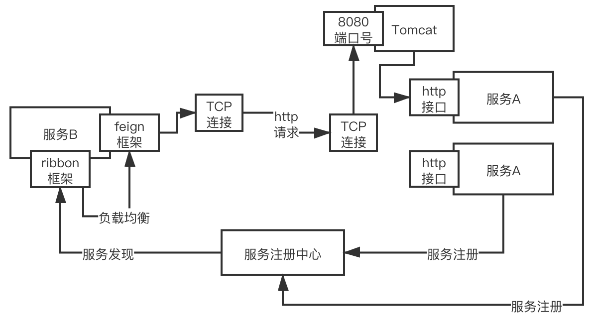 Feign+Ribbon: Spring Cloud NetFlix技术栈,轻量级框架,基于Spring MVC写的controller暴露出的http接口,本质是发送http请求给Tomcat,tomcat收到解析这个http请求,交给Spring MVC写的controller来处理;