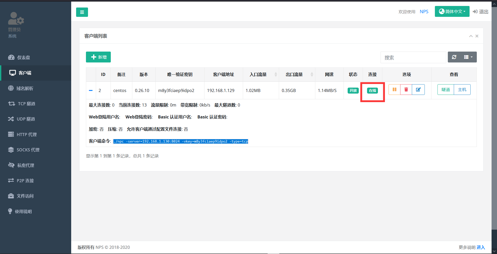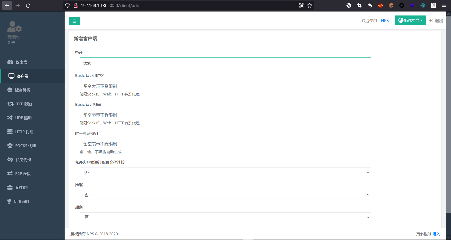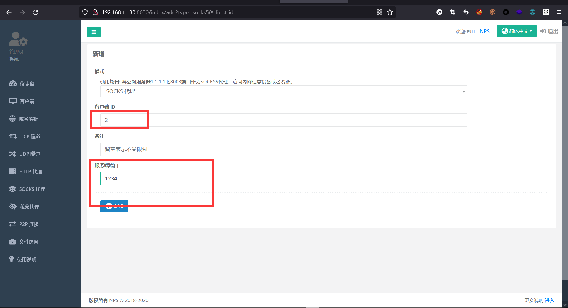 nps start访问该服务端的IP:8080端口