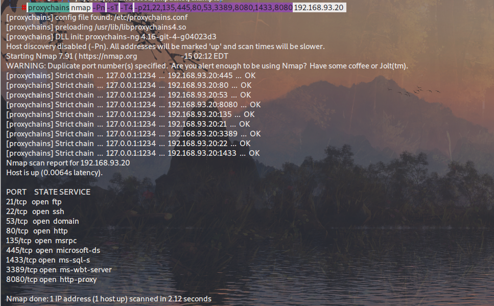 proxychains nmap -Pn -sT -T4 -p21,22,135,445,80,53,3389,8080,1433,8080 192.168.93.20