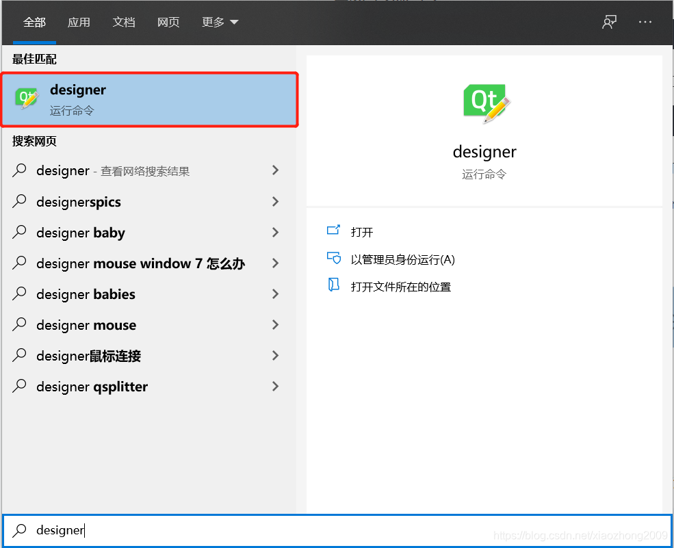 Win+S呼出Cornata主面板(搜索框),输入designer,如果看到跟下图类似的结果说明PyQt Designer已经被安装