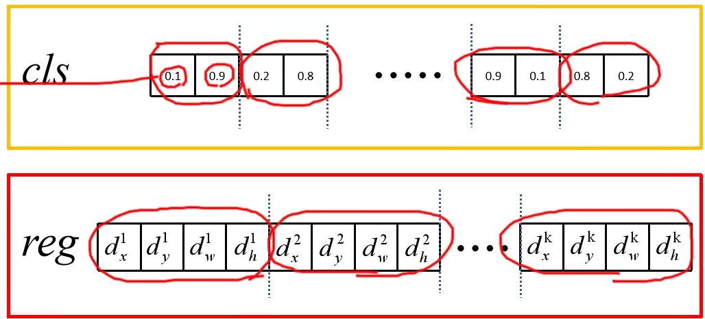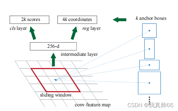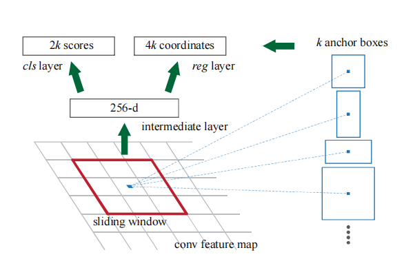 在feature map 用3*3conv,padding=1,得到shape与feature map 相同的特征矩阵,再分别经过1*1卷积,卷积核个数为2k,4k进行处理,得到cls,reg。原论文中K=9