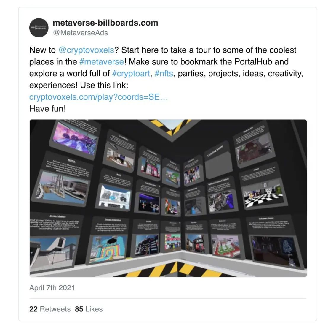 我们已经看到创作者将以太坊VR土地用于各种目的,比如美术馆、游戏锦标赛、每周聚会等等。由于21世纪被证明是超数字化的世纪,我们很可能在未来几年里继续看到从物质世界到数字世界的大规模迁移。