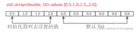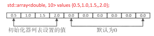 array 容器有多种初始化方式,如下代码展示了如何创建具有 10 个 double 类型元素的 array 容器:
