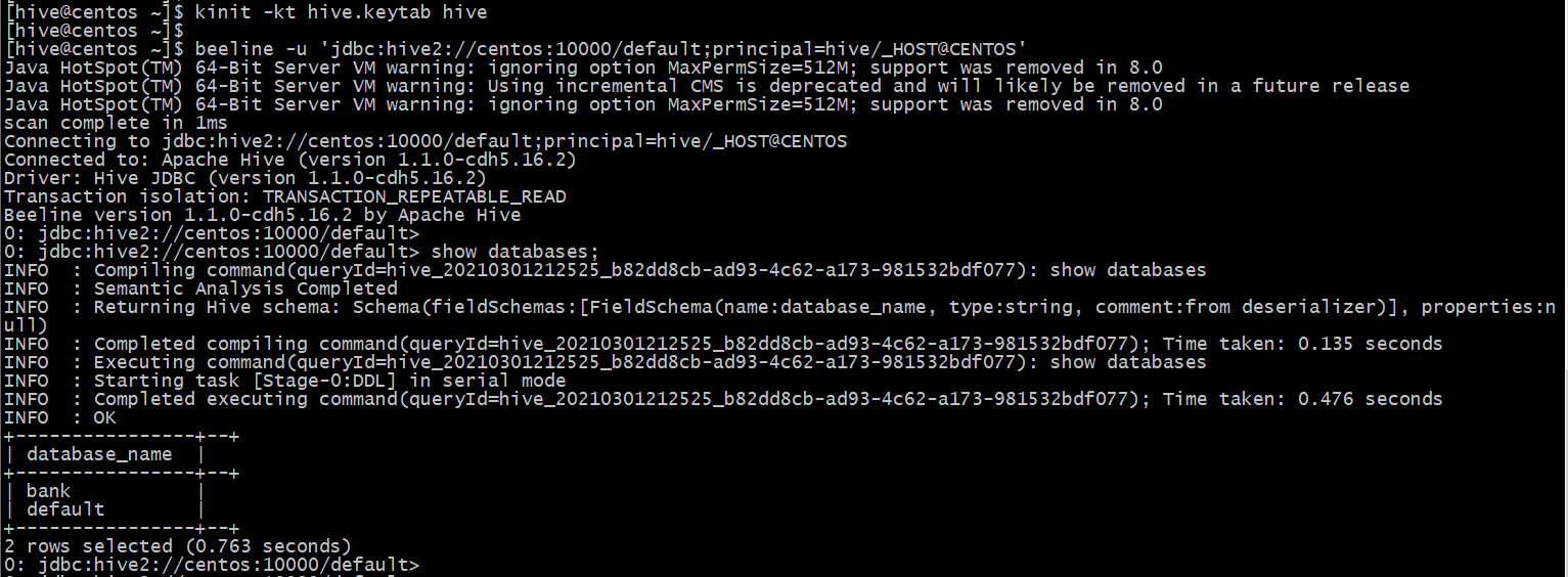 beeline -u 'jdbc:hive2://centos:10000/default;principal=hive/_HOST@CENTOS'