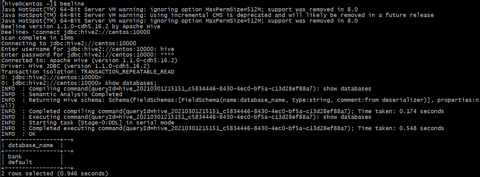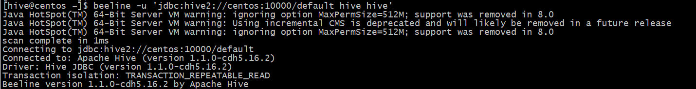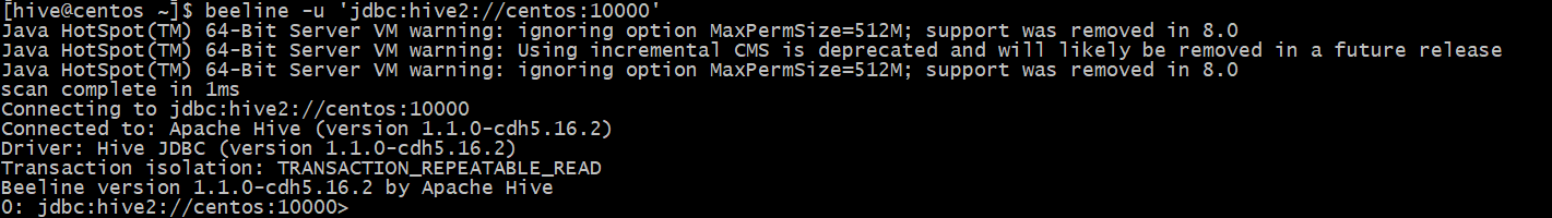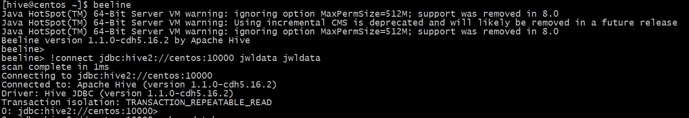 beeline -u 'jdbc:hive2://centos:10000'