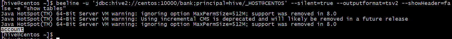 beeline -u 'jdbc:hive2://centos:10000/bank;principal=hive/_HOST@CENTOS' --silent=true --outputformat=tsv2 --showHeader=false -e "show tables"