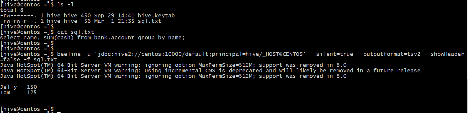 beeline -u 'jdbc:hive2://centos:10000/default;principal=hive/_HOST@CENTOS' --silent=true --outputformat=tsv2 --showHeader=false -f sql.txt