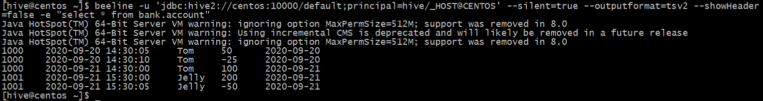 beeline -u 'jdbc:hive2://centos:10000/default;principal=hive/_HOST@CENTOS' --silent=true --outputformat=tsv2 --showHeader=false -e "select * from bank.account"