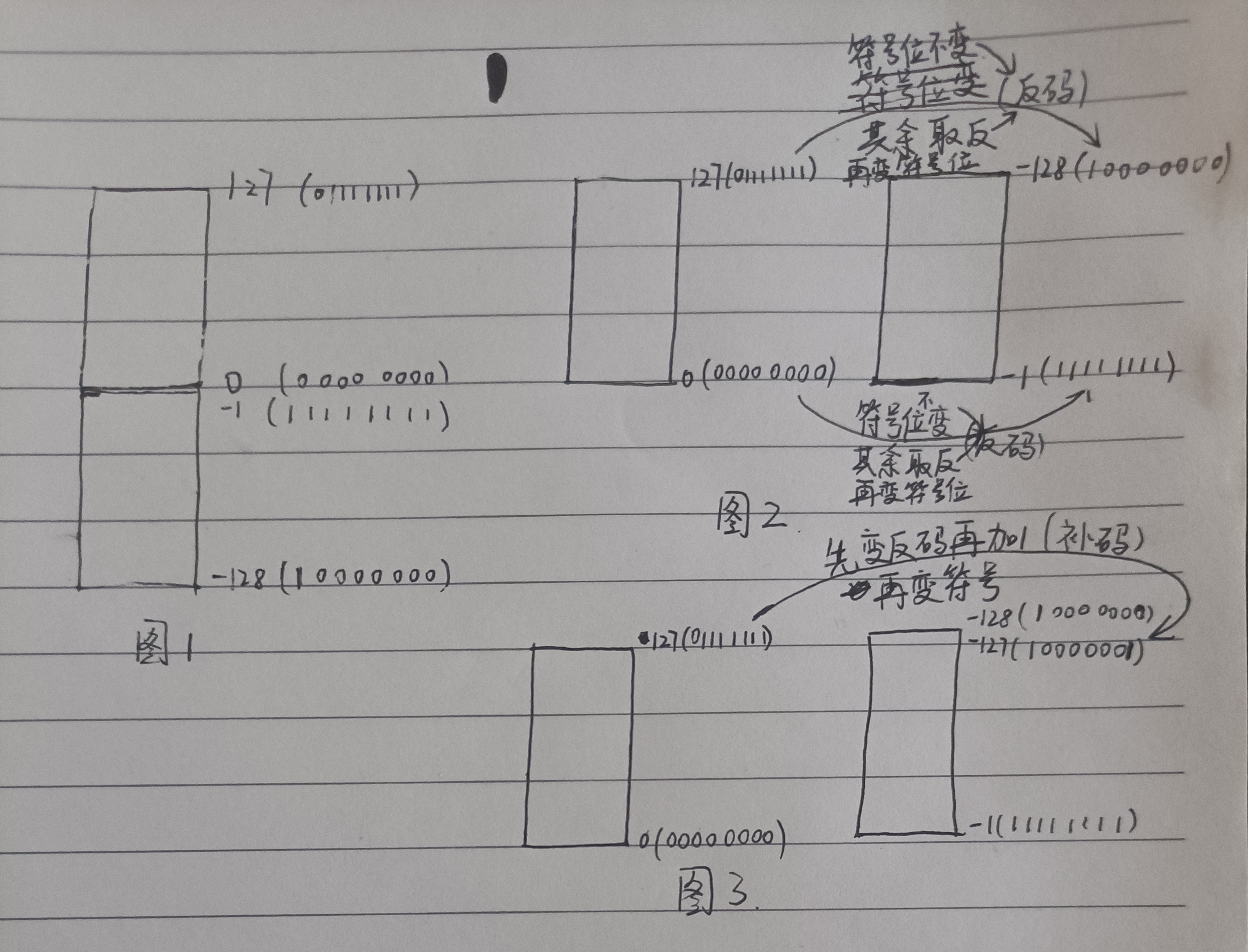 那么在计算机看来码1000 0010显然是大于1000 0001的,因此,根据大小关系,将1000 0000至1111 1111作为-128至-1的原码,而0000 0000至0111 1111作为0至127的原码,如下图1所示,这时我们会看到如下图2所示的对应关系,因为在正负数的表示中最容易想到的是反码,而反码所对应的数值与应该对应的数值又相差1,故而产生补码这一概念,通过反码加一的方式如图3即可方便的由一个数表示其负数。