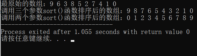#include<iostream> #include<algorithm> using namespace std; bool cmp(int a,int b) { return a>b; } int main() { int a[10]= {9,6,3,8,5,2,7,4,1,0}; cout<<"最原始的数组:"; for(int i=0; i<10; i++) cout<<a[i]<<" "; cout<<endl; sort(a,a+10,cmp); cout<<"调用三个参数sort()函数排序后的数组:"; for(int i=0; i<10; i++) cout<<a[i]<<" "; cout<<endl; sort(a,a+10); cout<<"调用两个参数sort()函数排序后的数组:"; for(int i=0; i<10; i++) cout<<a[i]<<" "; return 0; }输出结果: