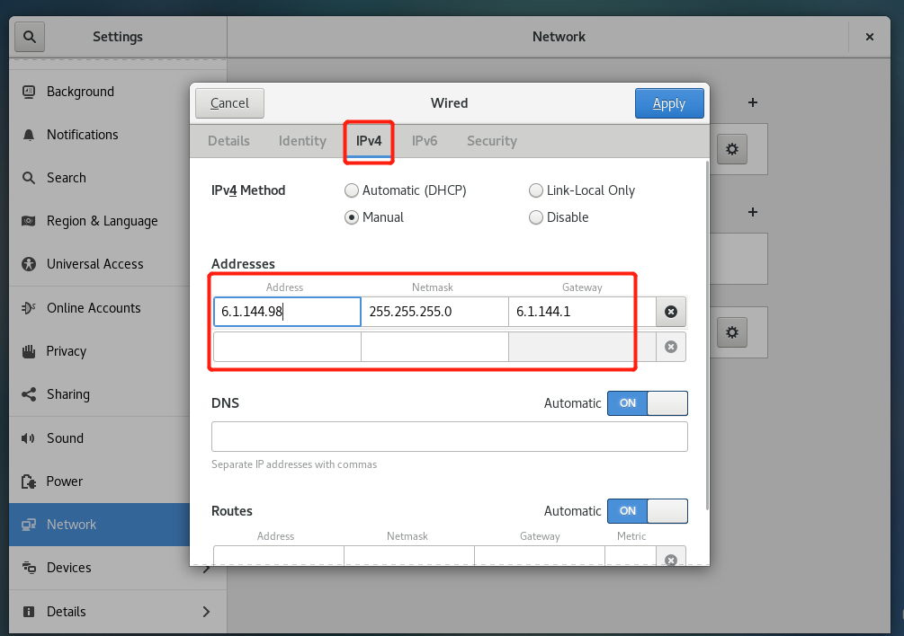 修改对应IP、网关,以6.1.144.98为例,修改好点击右上角“Apply”按钮确认修改