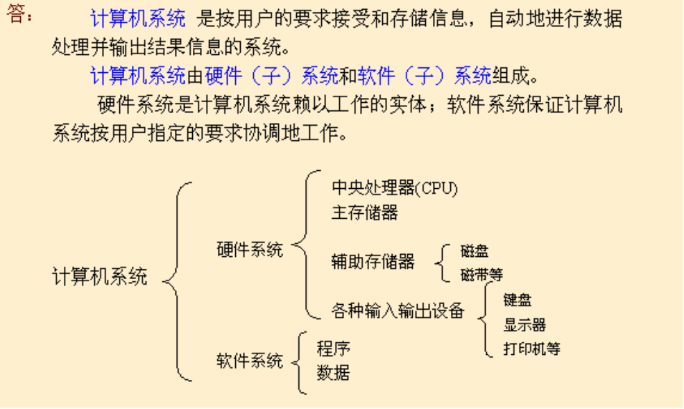 答:操作系统管理的计算机系统资源包括两大类:硬件资源和软件资源。计算机系统的硬件资源主要包括CPU、主存储器、辅助存储器(磁带、磁盘等)以及各种输入输出设备(键盘、显示器、打印机等);软件资源包括各种程序和数据。