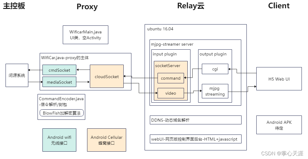 4)client端涉及从嵌入式设备获取视频流,这是一个socket; 再把视频流发给云端,这也是一个socket;这两个socket分别对应wifi网络和蜂窝网络;那么就涉及到两个socket绑定不同网卡的问题。Android上面当连接上WIFI网络后,蜂窝网络就自动关闭了(wifi优先,省流量的原因),在比较高的Android版本(6.0之后),Android提供了一种方法可以再wifi连接的同时再request蜂窝网络,实现双连接,然后分别绑定两个socket,公网服务器是通过域名访问的,所以对应的DNS查询也要切换到蜂窝上。这时client端其实就实现了某种软路由,把指定的数据从一个网卡搬到了另一个网卡。这也是项目最大的难点,疫情期间,费了两个周末,终于搞定。