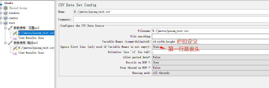 导入csv: Add => Config Element => CSV DATA SET Config