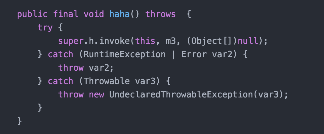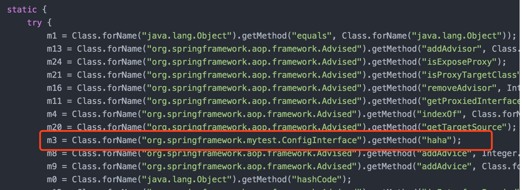 其中ConfigInterface是我自己定义的,其他都是系统的。在代理类的静态代码块,分别初始化了各个方法。其中的haha方法是用户自定义的。