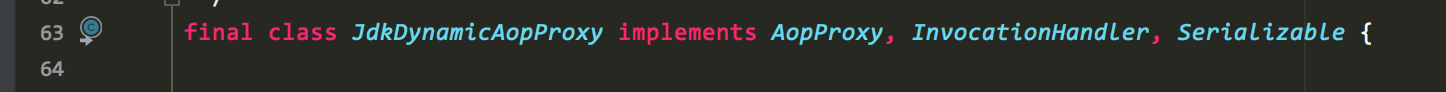 我们发现Spring aop传入的InvocationHandler 就是 对象JdkDynamicAopProxy,也就是上文中关键的对象h就是JdkDynamicAopProxy吗?。那JdkDynamicAopProxy到底是不是InvocationHandler类型呢?我们看下类JdkDynamicAopProxy的签名。