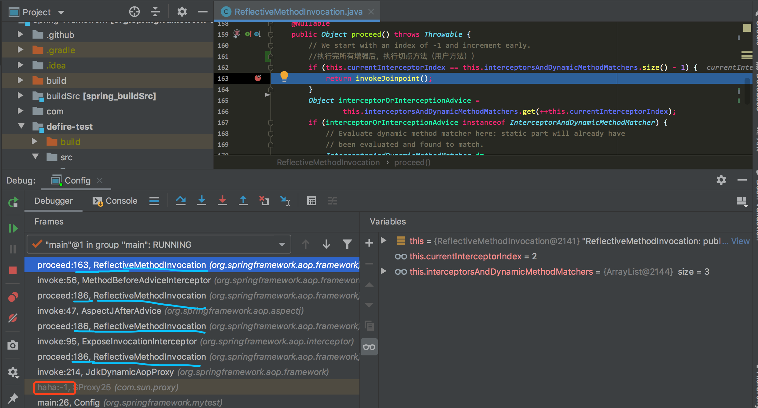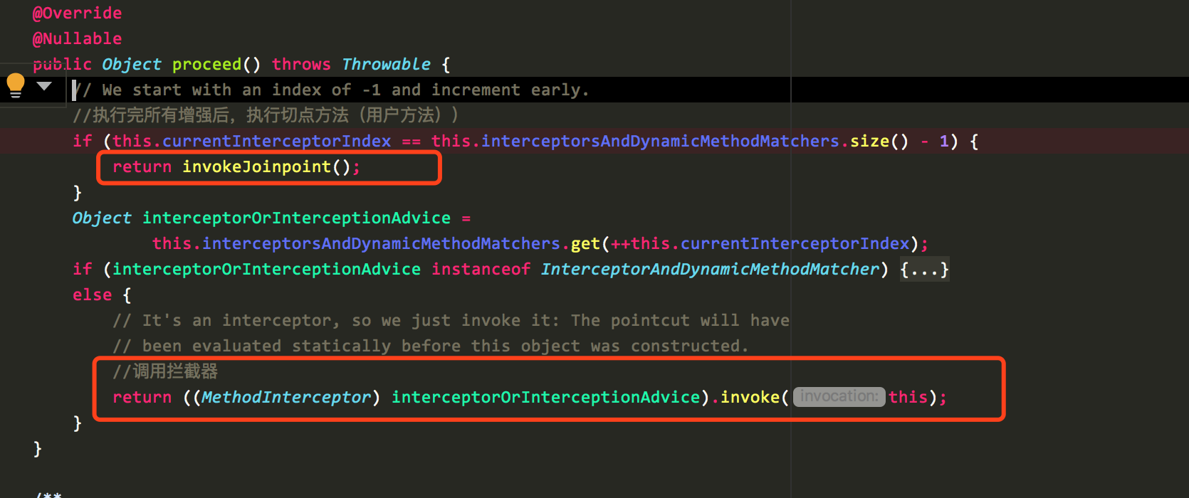 我们看下MethodInvocation的proceed方法是怎样处理这些拦截器的。MethodInvocation只是一个接口,真正的实现类是ReflectiveMethodInvocation。我们截取其proceed 方法。