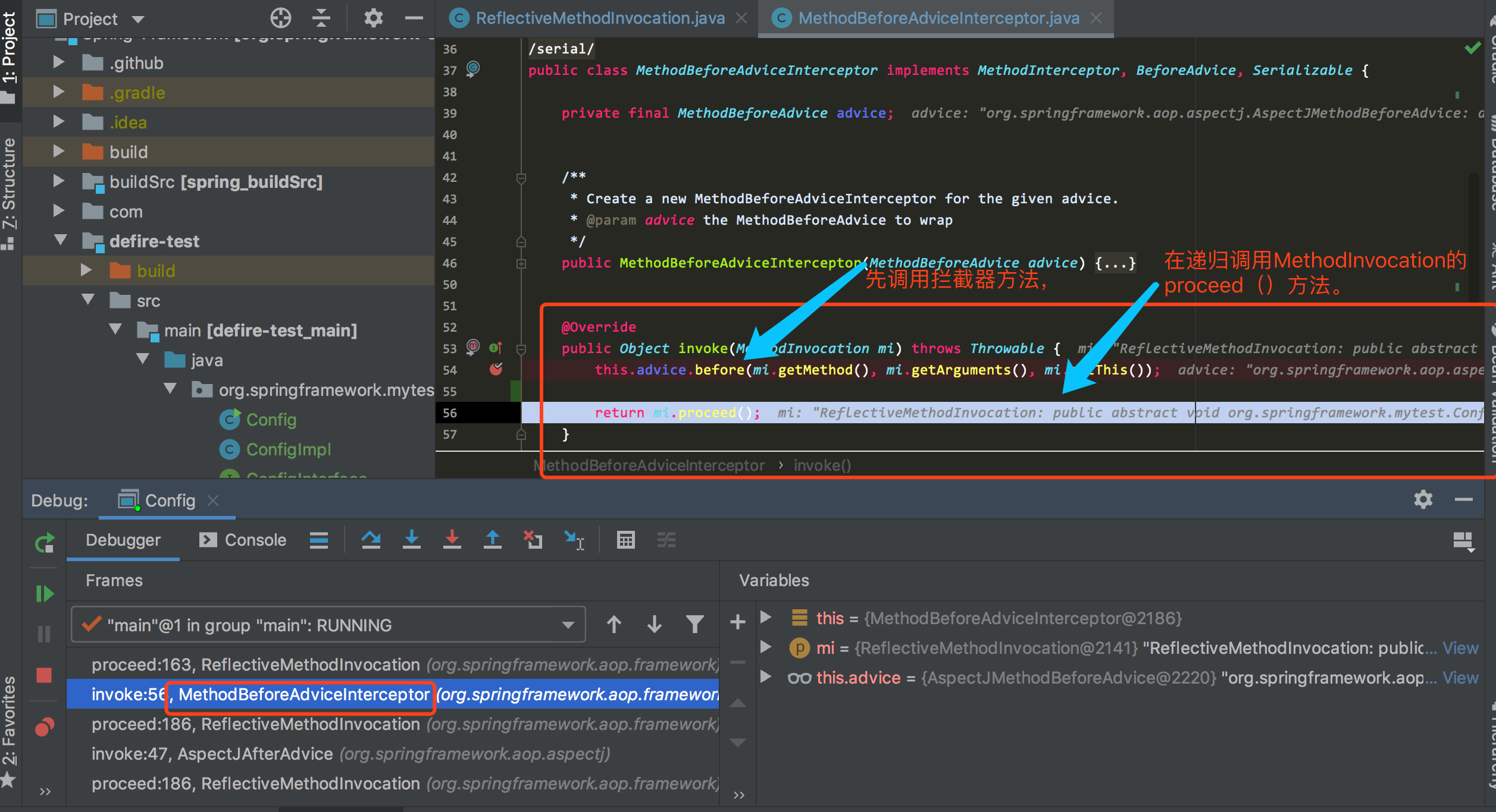 首先从MethodInvocation的proceed方法开始,进入前置拦截器执行,前置拦截器又递归调用MethodInvocation的proceed方法。如此依次递归所有的拦截器。