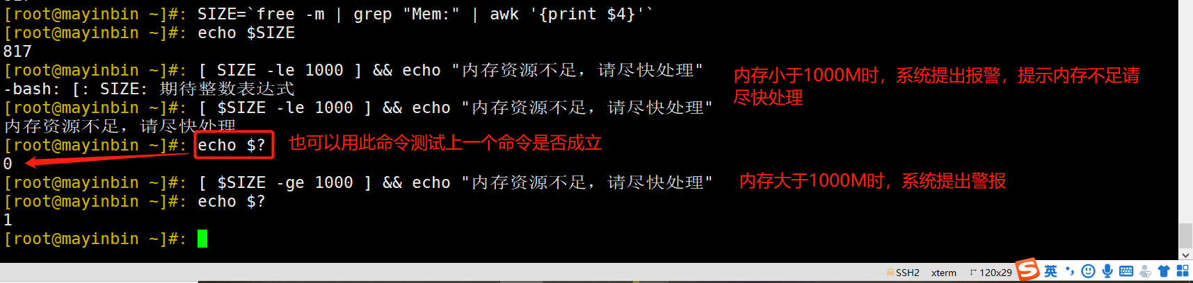 下面echo $?回报为0是条件不满足,此时是小于1000M