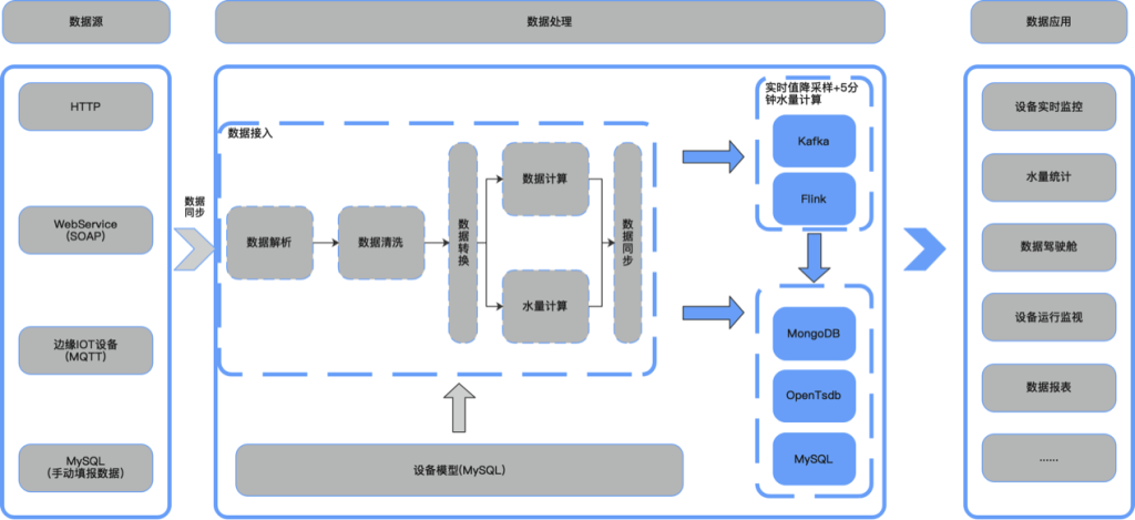数据通过物联网系统进入系统,经过处理后会根据设备类型被标准化为统一格式的数据,然后数据被写入 OpenTSDB 和 Kafka 中,供 Flink 消费。Flink 按照 Job 定义消费 Kafka 数据,并按照 MySQL 中的维表信息进行加工处理,然后写入 MongoDB 中;同时还将数据处理为分钟水量、日数量等业务实时所需的数据。