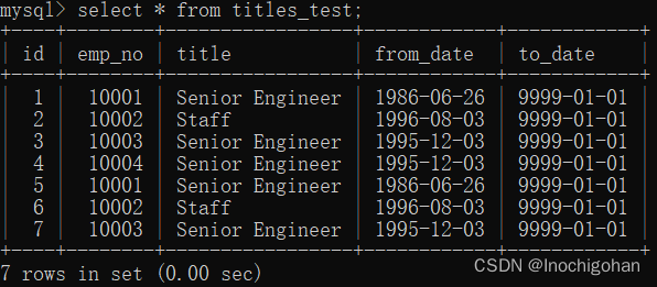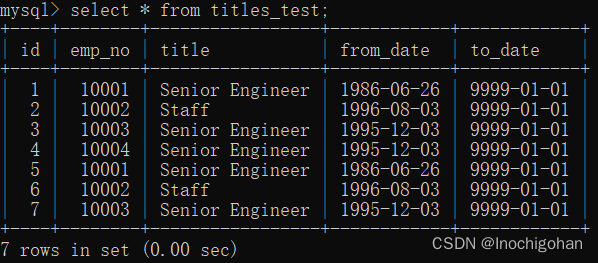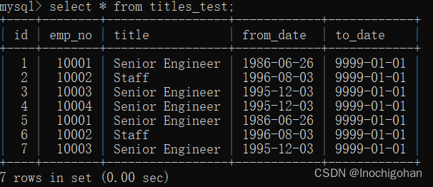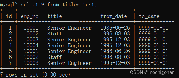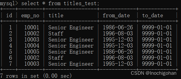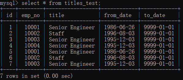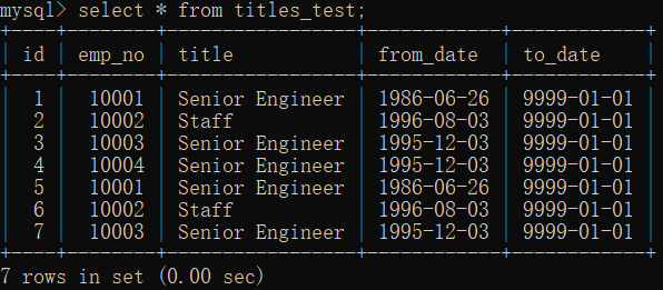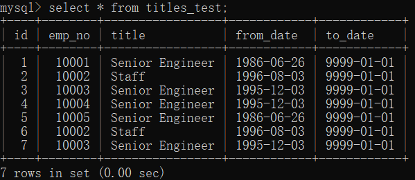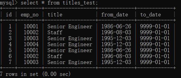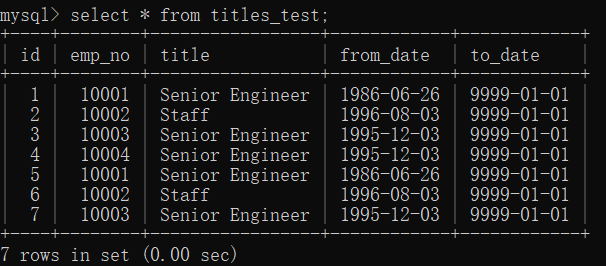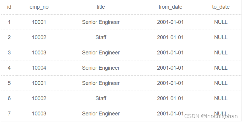 将所有to_date为9999-01-01的全部更新为NULL,且 from_date更新为2001-01-01。 更新后titles_test 表的值如下: